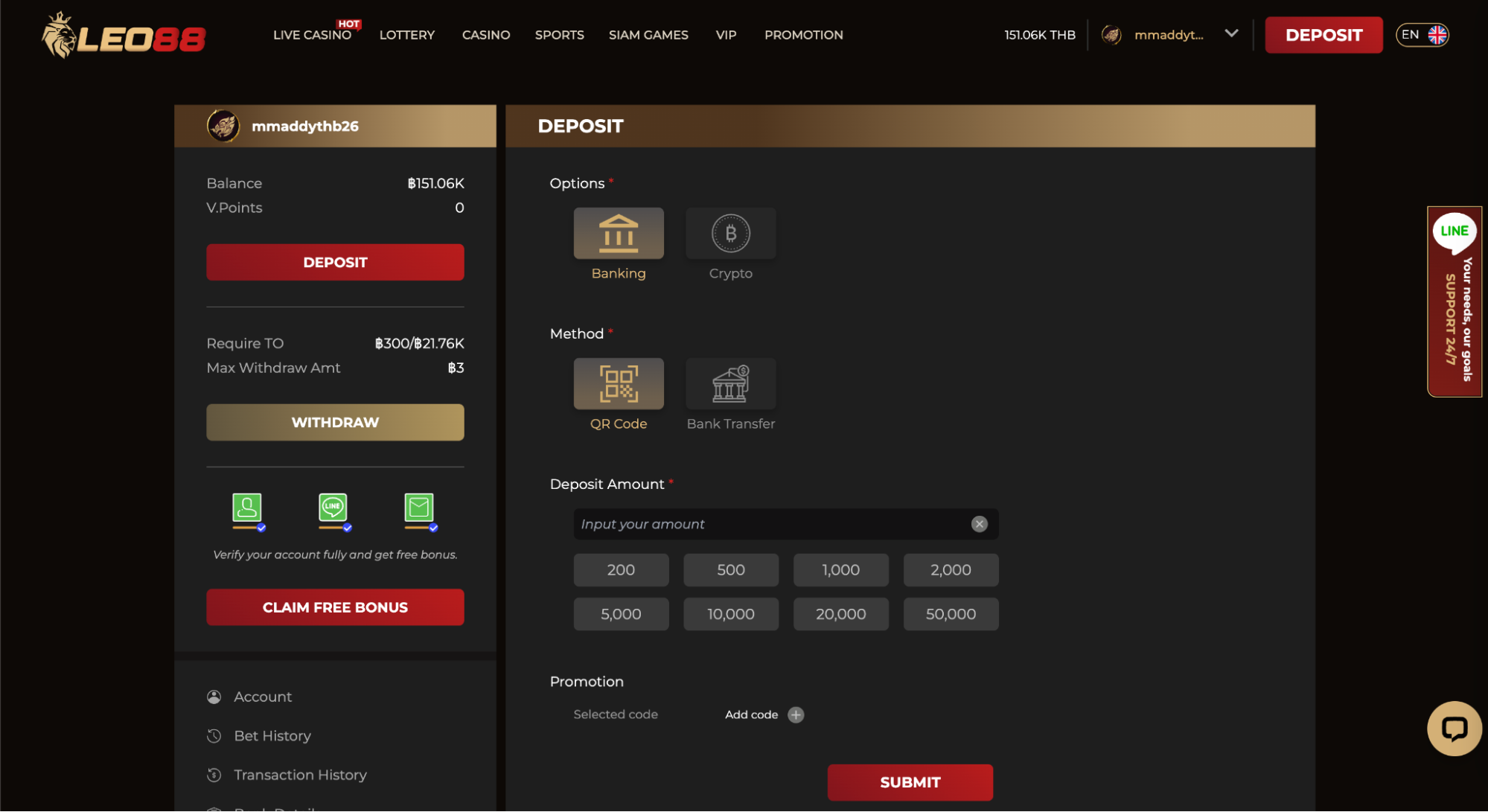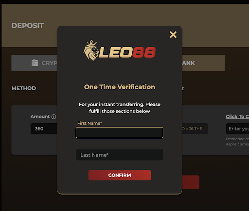In-Case: You have not verified your first & last name before. LEO88 requests input your information in this form. It will be updated at User Information (This process will be affected into withdrawal process)