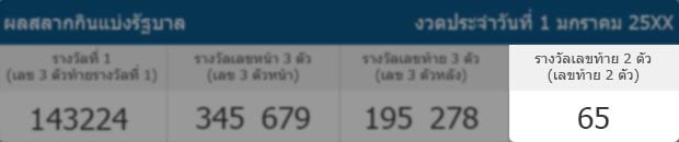 ผู้เล่นจะถูกรางวัล 2 ตัวล่าง ก็ต่อเมื่อวางเดิมพันหมายเลข: [65]