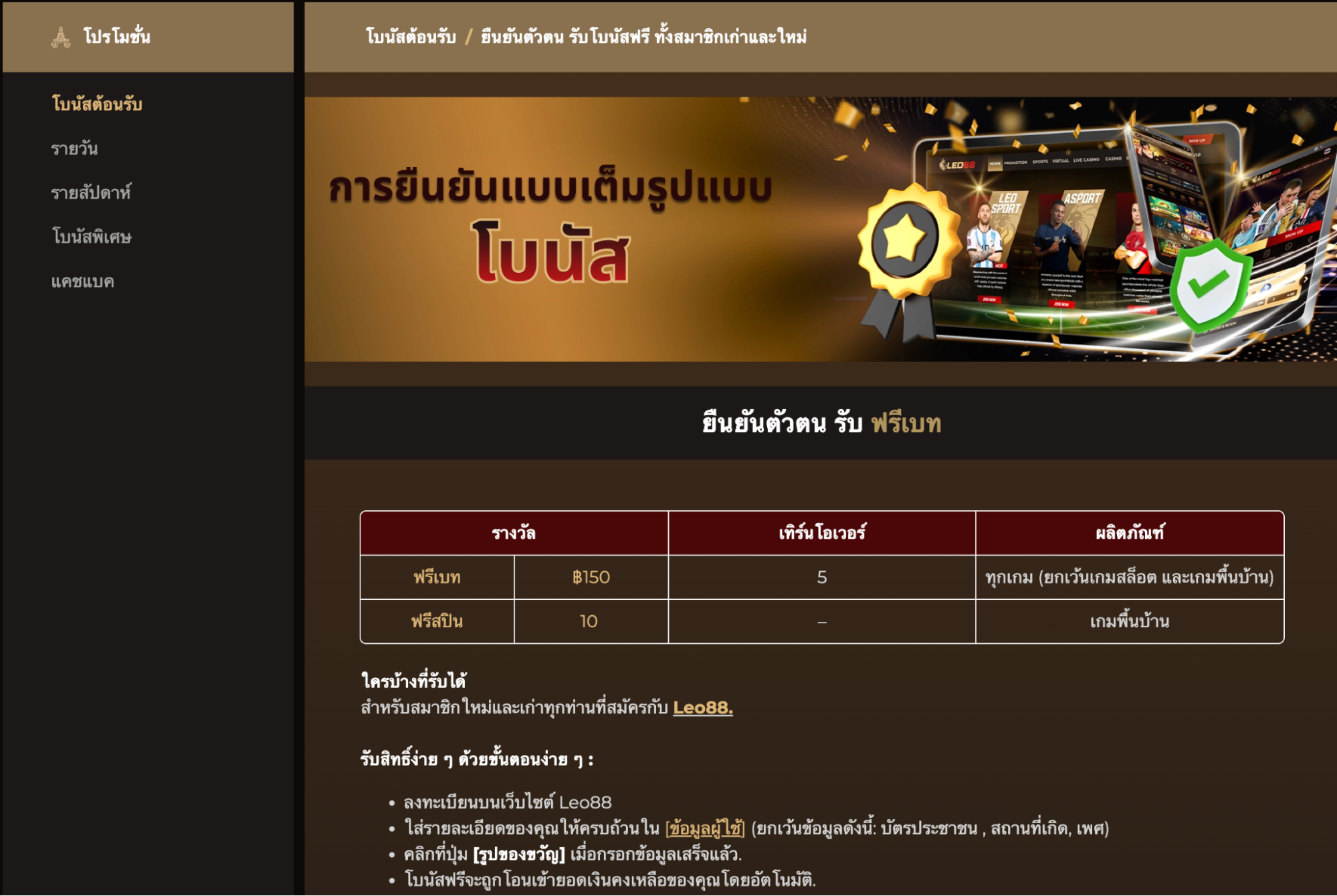- ขอรับสิทธิได้ที่หน้าโปรโมชั่น https://leo88.top/promotion/account-verification
