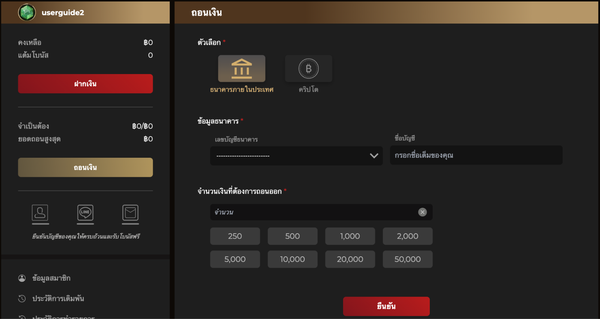 - หากชื่อนามสกุลไม่ตรงกับบัญชีธนาคาร คำร้องการถอนเงินจะถูกปฏิเสธทันที